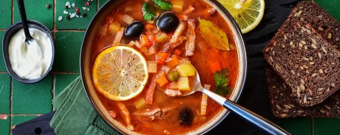 - O Solyanka pré-fabricado está pronto – só precisa de ser retirado do lume e deixado repousar durante 10-20 minutos. Pode ser servida com aneto e natas azedas.