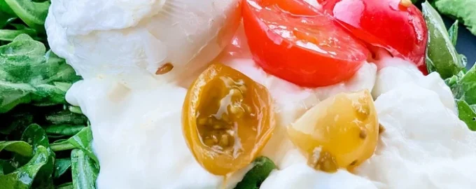 A salada tem por base um queijo burrata suave e macio com um recheio cremoso, tomates sumarentos, rúcula e um molho de azeite e vinagre balsâmico.